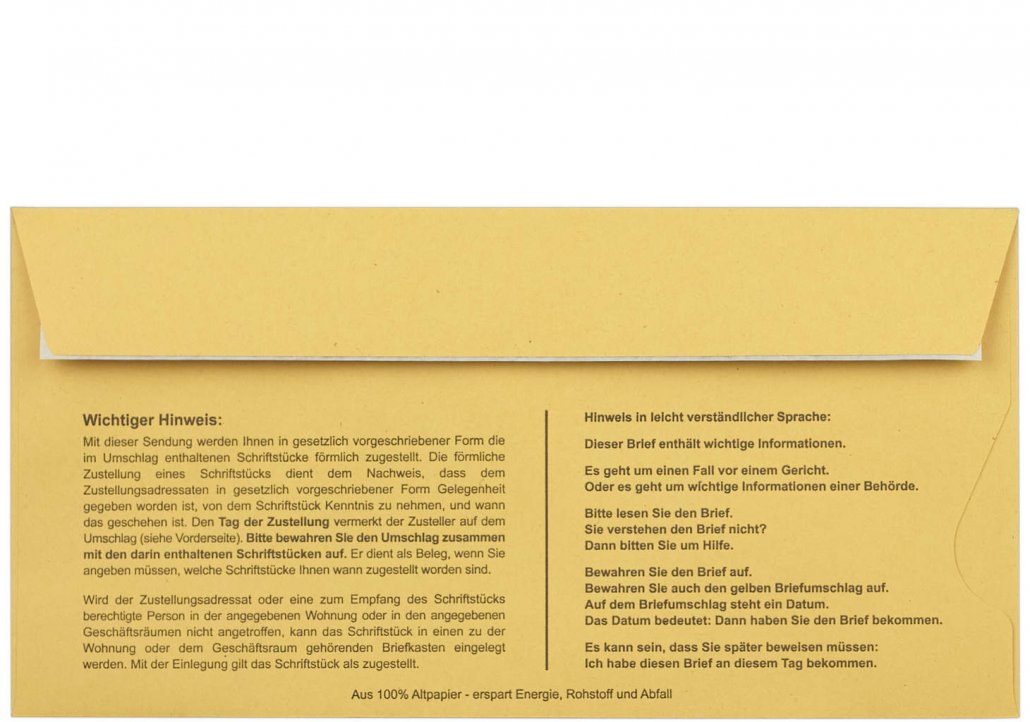 Wer ein förmliches Schreiben als Postzustellungsauftrag versenden möchte, kann dafür nicht beliebige Briefumschläge verwenden. Gemäß der Zustellungsvordruckverordnung (ZustVV) gibt es genaue Festlegungen, wie Urkunden und Umschläge für den Postzustellungsauftrag aussehen müssen. Postzustellungsumschläge, die den gesetzlichen Vorgaben entsprechen, können Sie direkt bei uns bestellen.